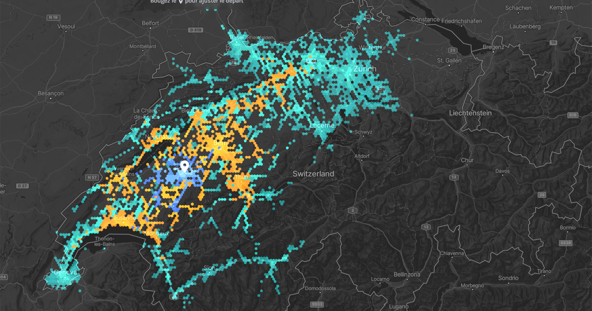 Comment savoir jusqu’où l’on peut se déplacer en transports publics en Suisse, en une, deux ou trois heures ? C’est la question à laquelle Isochrone.ch, une application web développée par Aubry Cholleton, ingénieur chez Fairtiq, entend répondre. Le principe est simple mais puissant : depuis un point de départ unique, l’outil affiche toutes les zones accessibles en transports publics, en fonction du temps de trajet. Bus, trains, bateaux ou remontées mécaniques sont pris en compte.