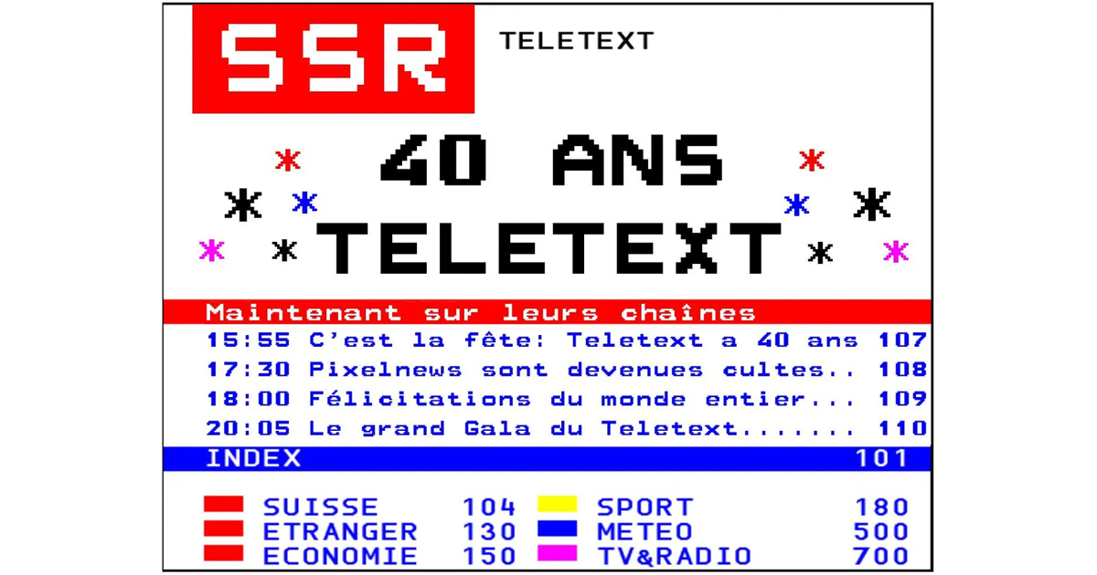 Le télétexte se distinguait par son design pixellisé emblématique, caractéristique des années 80, avec ses huit couleurs, 25 lignes de 40 caractères par page, et un maximum de 800 pages disponibles. Bien que concurrencé par le web, le télétexte a su évoluer en se rendant disponible sous forme d’application et en ligne via teletext.ch depuis 2009.